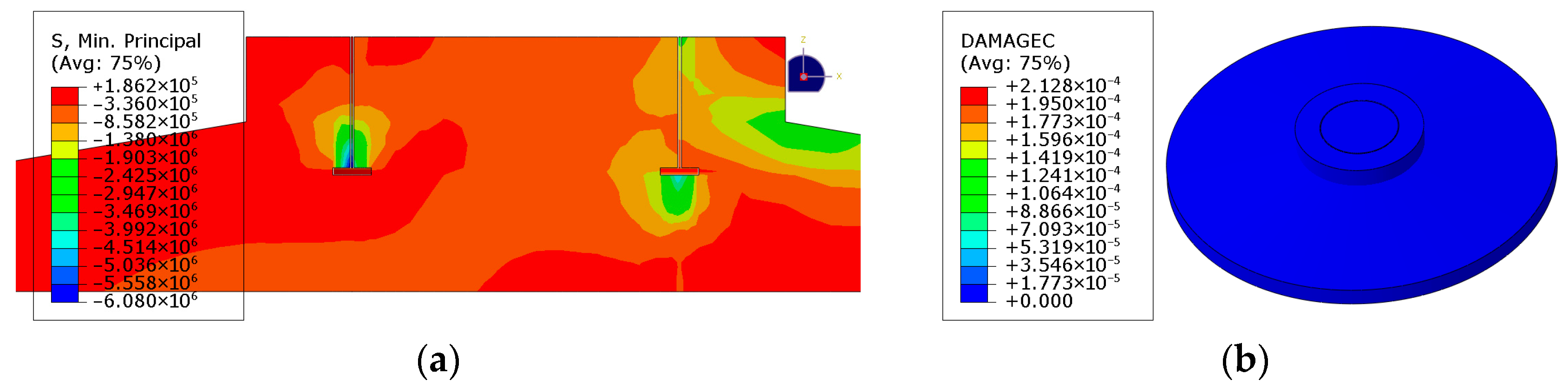 Compressive stress nephogram of foundation concrete. (a) Compressive stress nephogram. (b) Compressive plastic damage nephogram.