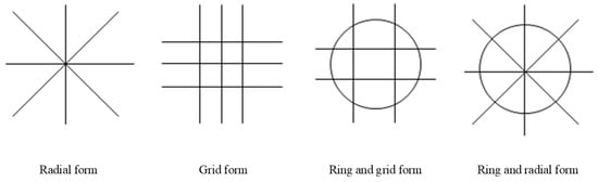 Through a geometric decomposition into radial, grid, and ring units [17], this study identifies four core network morphologies—radial, grid, ring–radial, and ring–grid, as illustrated in Figure 1. These four morphologies encompass the representative skeletal structures of mature global URT networks, ensuring comparability in transfer convenience [18,19].