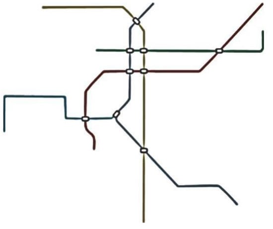As shown in Figure 3, the basic characteristic of a colinear form is that two rail lines use parallel or shared tracks at transfer stations, where passengers transfer to the other line in the same or opposite direction at the same platform, and there are usually continuously available transfer stations along the line. Cities with this network form usually have a unique urban form and history. At the same time, not every line operates on a common line or common track [24]. During the construction and development of a colinear form network, a combination of colinear and intersection forms can be used to expand the network.
