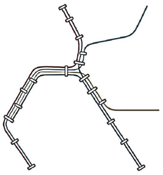 As shown in Figure 2, the basic feature of the intersecting form is that two rail lines are separated from each other at transfer stations. Two lines with a transfer relationship usually have one or more public transfer stations, which are often not continuous [23]. URT networks achieve relatively high network coverage with fewer lines, which facilitates rapid expansion of the network to cover major passenger corridors.