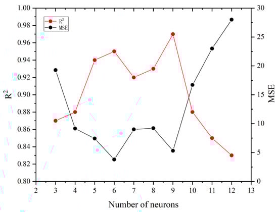 As the middle layer of the model structure, the hidden layer plays a crucial role in the model’s operation. If the number of neurons in the hidden layer is too high, it can lead to overfitting; if it is too low, the model may be undertrained, which negatively impacts prediction performance. However, there is no ideal analytical formula for determining a reasonable number of nodes in the hidden layer, which is also a shortcoming of the BPNN in practical applications. In this paper, we first use the empirical Equation (7) to determine the approximate range of the number of neurons in the hidden layer and then carry out several trial calculations to determine the optimal number of neurons in the hidden layer.