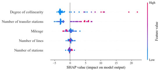 In contrast, the influence of X3 on K is more complicated, and it can be seen that the SHAP value of the number of transfer stations increases and then decreases as the color becomes red. This pattern indicates that beyond a certain scale, merely increasing the number of transfer stations does not uniformly yield higher convenience. Therefore, the X3, X5, and K do not have a simple linear relationship, and more in-depth research is needed. The influence of other factors, such as the mileage and the number of lines, is comparatively lower, as their SHAP values are clustered closer to zero.