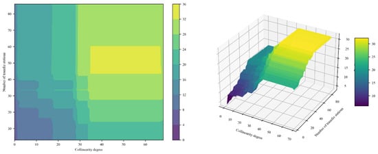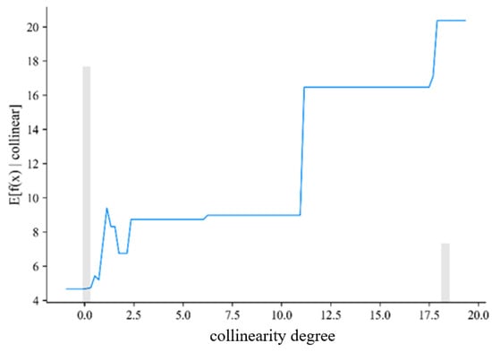 To further elucidate the nonlinear influence of the collinearity degree (X5) identified by the SHAP analysis, a partial dependence plot (PDP) was employed. As can be seen from Figure 6, the PDP reveals a clear stepwise pattern: K increases steeply at collinearity thresholds of approximately 2%, 11%, and 18%, with stable plateaus observed between these points. Additionally, the grey bars delineates the density distribution of collinearity degree, with peaks around 0 and 17.5 highlighting the most prevalent levels. This demonstrates the discontinuous nonlinear impact of collinearity on transfer convenience and provides critical insights for staged network design.