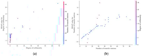 SHAP values of collinearity degree (X5) and number of transfer stations (X3): (a) SHAP values of collinearity degree (X5). (b) SHAP Value of number of transfer stations (X3).