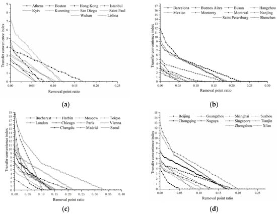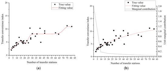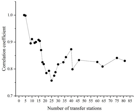 With the expansion of cities and the gradual networking of rail systems, it is difficult for passengers to complete a journey without transfer, and it is often necessary to transfer between lines [70,71]. Transfer refers to the act of passengers traveling between different lines and purchasing tickets again without leaving the paid area of the station [72]. In this study, a transfer station is defined as a node where passengers can switch between at least two different lines without exiting the fare-paid area, encompassing same-platform, cross-platform, and passageway-based transfers. A station is counted as a single transfer node irrespective of the number of lines converging at it. Firstly, setting up a certain number of convenient transfer stations increases the route choice of passengers, so that passengers can travel in a more flexible way. Secondly, transfer can balance the passenger flow and prevent the passenger load from being too high. In addition, transfer increases the flexibility and stability of network operation to a certain extent.