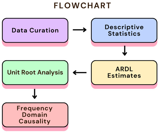 where – denote long-term parameters, – denote short-term parameters, and ECT is the Error Correction Term. In addition to the ARDL approach, the Frequency Domain Causality method [72] was also utilized as seen in the studies of [19,57]. This approach is also called spectral Granger causality. It reveals the extent of frequency domain evaluation, which may be used to find causative cycles and nonlinearity at both high and low frequencies. This method’s capacity to identify causal relationships between variables at various frequencies is one of its main advantages [19]. The analysis flowchart is presented in Figure 1.