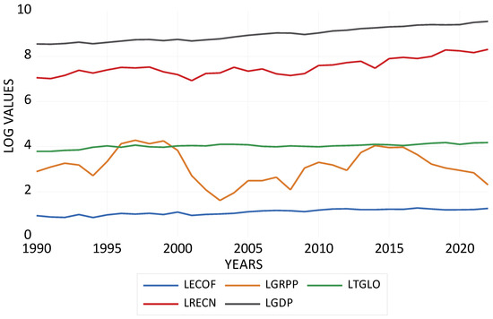 This research used data from 1990 to 2022. It is important to state that the study timeframe and sample size were limited by the lack of data. The variables employed include ECOF, GRPP, TGLO, RECN and GDP. ECOF is the dependent variable; GRPP, TGLO, RECN and GDP are the independent variables. In addition, to lessen heteroscedasticity, all of the study’s variables are converted to natural logs. Table 1 displays the sources and metrics for the variables of interest.