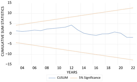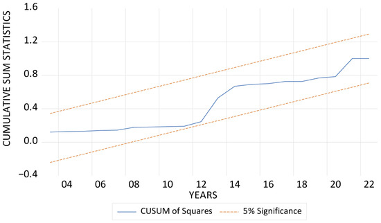 In Table 5, it is evident that the association between LGRPP and LECOF is positive in the long run. This means that LGRPP contributes to the degradation of the environment. Specifically, a 1% increase in LGRPP leads to a 0.02% increase in LECOF. Regarding the LTGLO and LECOF nexus, the relationship is negative and insignificant. This means that LTGLO contributes to the quality of the environment, although the impact is not significant. This, somewhat, in a way confirms the Pollution Halo Hypothesis. Furthermore, although insignificant, LRECN also reduces LECOF, implying that, as LRECN increases by 1%, LECOF decreases by 0.08%. Finally, LGDP contributes to the degradation of the environment. A 1% increase in LGDP spurs LECOF by 0.42%. In the short run, LTGLO reduces LECOF at no lag and at lag 2. More specifically, a 1% increase in LTGLO reduces LECOF by 0.43% and 0.25%, respectively. In addition, just like the long-run result, LGDP leads to a decline in the quality of the environment. A 1% increase in LGDP leads to a decline in the quality of the environment by 1.01%. In line with theoretical assumptions, the ECT is negative and significant. In detail, the ECT confirms that the economy will move back to equilibrium at an adjustment speed of 0.65%. The regressors account for 87% and 85% of the variance of LECOF, according to the R-squared and adjusted R-squared values, respectively. Based on the outcome of the diagnostic tests, our model is normally distributed and homoscedastic and has no serial correlation. Figure 3 shows the CUSUM and CUSUMQ, which confirm the stability of the model.