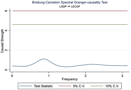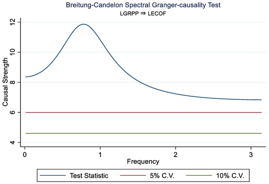 In Figure 4, the Frequency Domain Causality confirms that LGRPP Granger-causes LECOF in the short, medium and long term. LTGLO also Granger-causes LECOF in the short, medium and long term. LRECN, on the other hand, only Granger-causes LECOF in the long run. The short- and medium-term effects are insignificant. Furthermore, there is no causal relationship between LGDP and LECOF. It is important to state that causation does not necessarily mean that there is a relationship. Causation shows that a change in one variable can lead to a change in another variable.