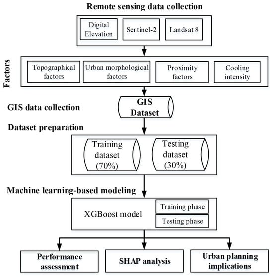 The research workflow, illustrated in Figure 1, begins with the collection of remote sensing data from multiple sources, including the NASA Shuttle Radar Topography Mission (SRTM) Digital Elevation 30 m, Sentinel-2, and Landsat 8 imagery. These datasets are processed to extract crucial factors, including topographical characteristics, urban morphological features, proximity metrics, and CI values. All spatial information is subsequently integrated into a GIS dataset, which is partitioned into training and testing sets for model development. An XGBoost machine learning model (version 1.6.2) is constructed using the training dataset and validated with the testing dataset. The results are further evaluated by assessing model performance via various metrics, interpreting SHAP values for feature importance, and deriving strategies to support urban planning in the study area.