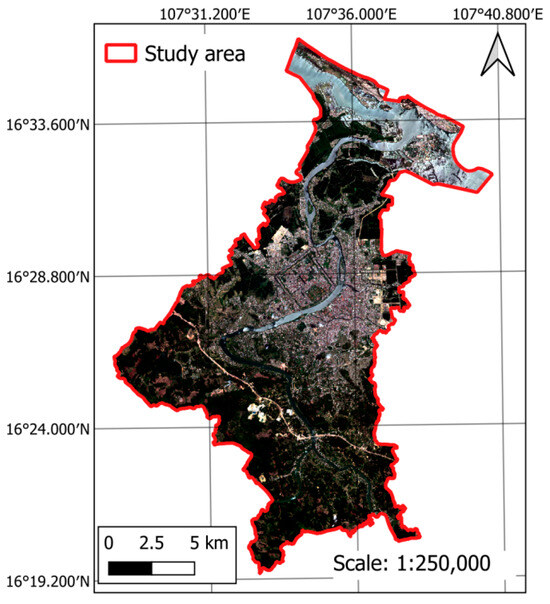 Hue City, situated along the Central Coast of Vietnam, is an administrative and cultural center of the region. Hue is internationally recognized as a UNESCO World Cultural Heritage city. The area encompasses the Complex of Hue Monuments—a renowned site of outstanding historical, architectural, and cultural value. The city’s urban center (refer to Figure 2), comprising Phu Xuan Ward and Thuan Hoa Ward, spans a total area of approximately 266 km2. This urban center is selected as the study area of the current work.
