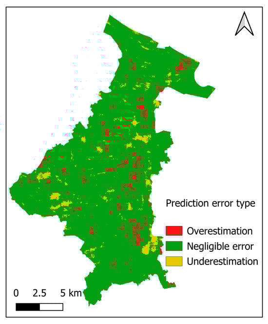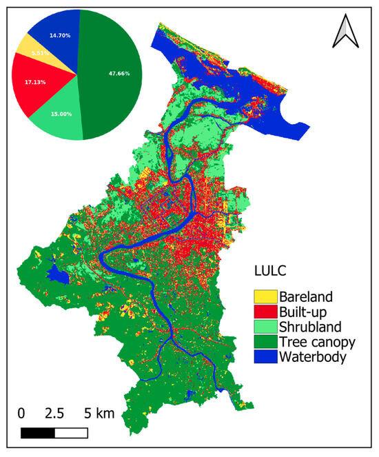 LULC mapping in this study employs a machine learning-based classification workflow to ensure high accuracy. Sentinel-2 satellite imagery was processed and analyzed using a random forest (RF) classifier implemented within the Google Earth Engine (GEE) platform. Via several trial-and-error runs, the selected RF model consists of 30 trees, incorporating a total dataset of 2000 samples, with 500 samples assigned to each class. The LULC classes include bareland, built-up, vegetation, and waterbody. The dataset was divided into 70% for training and 30% for testing, resulting in a satisfactory testing accuracy of roughly 93%. The detailed classification performance is summarized in Table 2.
