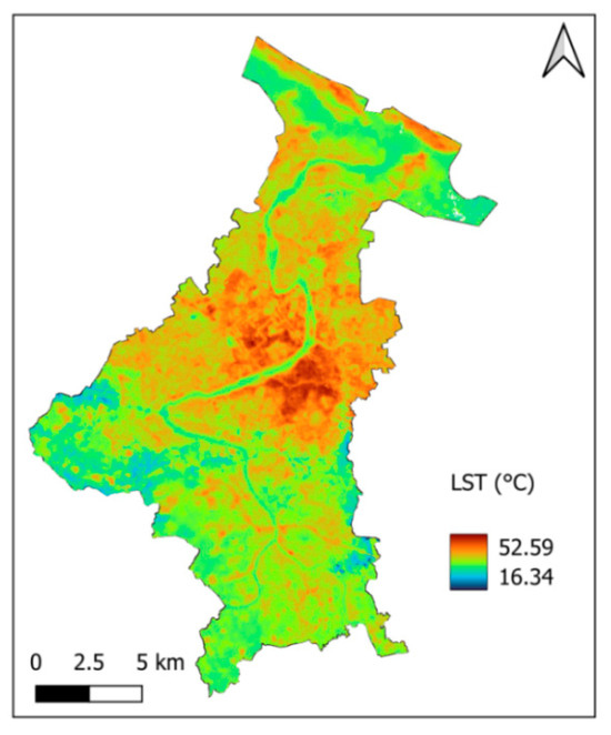 The thermal band from Landsat 8 imagery was utilized to extract LST data for the study area, focusing on records from the 2024 dry season, a period marked by multiple heat waves in the region. The resulting LST map, depicted in Figure 5, was prepared in QGIS. The preparation of this map includes several steps carried out in the GEE’s code editor.