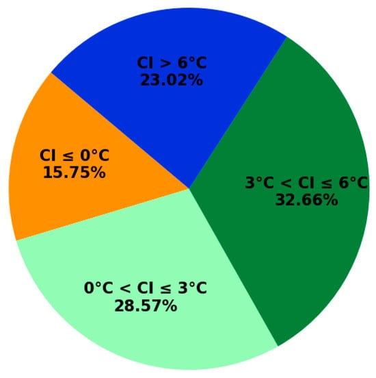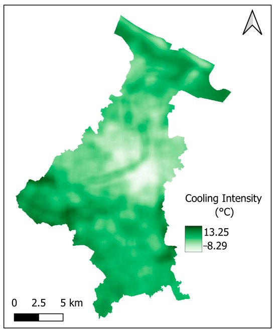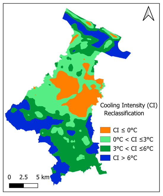 In this study, CI is employed as a quantitative measure to assess the thermal performance of urban blocks measuring 900 × 900 m (30 × 30 pixels) within the study area. The CI is calculated by subtracting the mean LST of an urban block from the mean LST of all built-up pixels across the study area. Based on the LST map analysis, the average LST of all built-up areas is found to be 40.28 °C. This approach enables the evaluation of each block’s relative effectiveness in mitigating urban heat, with higher CI values indicating greater reductions in urban LST compared to the region-wide built-up average. The CI map is presented in Figure 6.