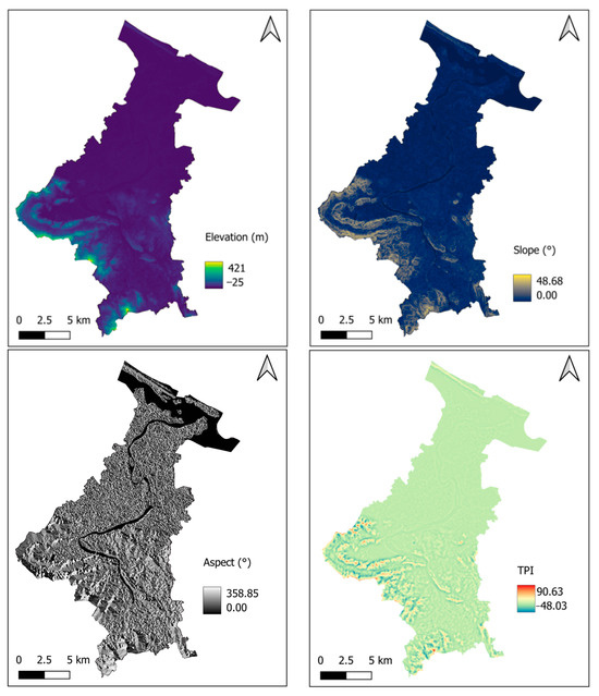 The aforementioned variables collectively capture the influence of both physical terrain and landscape configuration on the CI across urban blocks. Topographic variables have been shown to significantly influence the thermal behavior in urban environments [72,73]. The maps of topographic features are presented in Figure 7. Moreover, it is widely recognized that the primary driver of changes in urban LST is the conversion of natural and vegetated areas into impervious surfaces, such as concrete and asphalt [74]. Therefore, landscape composition or PLAND should be employed in the analysis of urban heat stress [24,75,76,77]. The PLAND maps are demonstrated in Figure 8. The landscape composition index can be computed as follows [78]: