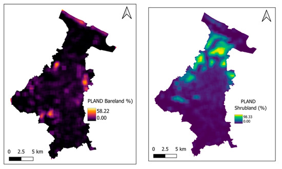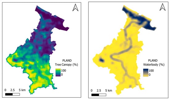 - Landscape composition: percentages of landscape (PLAND) of bareland, shrubland, tree canopy, and waterbody.