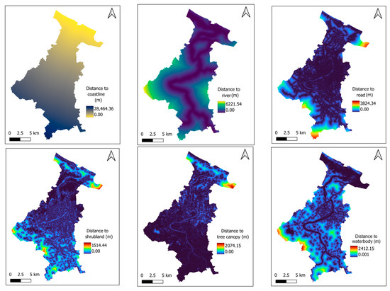 Proximity features, including the distance to coastline, river, road, shrubland, tree canopy, and waterbody, essentially influence the CI within urban blocks [79,80,81,82]. Urban blocks located closer to water bodies (coastlines, rivers, channels, and retention ponds) benefit from enhanced evaporative cooling and increased humidity, resulting in lower LST compared to those farther away. Tree canopy and shrubland patches also enhance CI of neighboring areas by providing shade and facilitating heat dissipation through transpiration, which reduces ambient temperature within and around the block. Conversely, blocks closer to roads and other impervious surfaces tend to experience higher LST compared to those surrounded by natural surfaces due to the absorption and retention of heat. In this study, the road data in Hue City is extracted from the OpenStreetMap source via https://extract.bbbike.org/ (accessed on 7 January 2025). The maps of proximity features are shown in Figure 9.