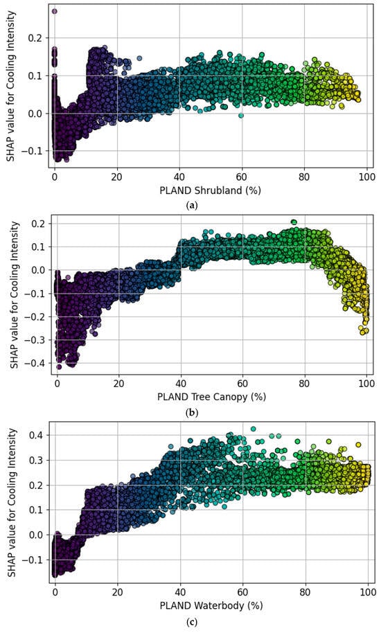 In addition, machine learning algorithms have demonstrated excellent capability in identifying complex nonlinear relationships among landscape and environmental features [25]; this capability enables them to achieve high prediction accuracy in geospatial modeling of urban land surface temperature [26,27]. Among the machine learning methods, Extreme Gradient Boosting (XGBoost) offers notable advantages for geospatial modeling, including its ability to analyze high-dimensional datasets and capture complex nonlinear relationships among various influencing factors [28,29]. Combined with SHapley Additive exPlanations (SHAP), XGBoost can provide valuable insights into the importance and effects of various variables influencing the cooling performance of urban blue-green space [30,31].