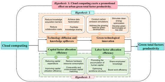 Under the dual constraints of the digital economy, cloud computing technology has exerted a long-term and nonlinear “butterfly effect” on the low-carbon economy, with its environmental incentive effects emerging as a key driver of fluctuations in ecosystem carbon emissions [36]. On the one hand, due to the efficient data processing capabilities of cloud computing [37], it can facilitate the data-driven intelligent management of energy systems. Through real-time data analysis and demand forecasting, it optimizes the allocation efficiency of energy factors, further constraining energy consumption and reducing carbon emission intensity [38,39]. On the other hand, cloud computing provides critical support for clean energy development, enhancing the dispatching capabilities of solar and wind power generation and reducing grid integration difficulty and utilization costs [40,41]. This accelerates the substitution of traditional fossil energy sources, thereby reducing carbon emissions and achieving green and low-carbon development. Meanwhile, cloud computing facilitates the gradual evolution of the industrial structure in a low-energy-consumption direction, promoting low-carbon economic growth [42]. Over the long term, the diffusion of cloud computing can promote the green and low-carbon transformation of manufacturing industries and green economic development through transforming production patterns, reshaping employment structures, and driving technological innovation [43,44,45]. In summary, leveraging its advantages in information processing, cloud computing not only alleviates energy consumption challenges but also promotes low-carbon industrial transformation and drives green and sustainable economic development, emerging as a digital enabler for low-carbon transformation. By advancing the green and low-carbon development of the economy, cloud computing can directly enhance urban green total factor productivity. Therefore, this study proposes Hypothesis 1.