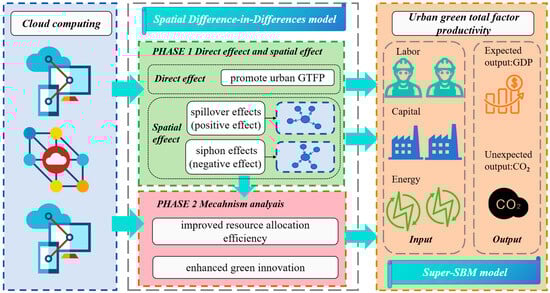 Second, Figure 2 presents the overall research framework diagram. As shown in Figure 2, in phase 1, this study uses spatial DID to analyze the direct effects and spatial effects of cloud computing on urban GTFP. Additionally, in phase 2, it examines the main mechanisms through which cloud computing promotes GTFP by improving resource allocation efficiency and enhancing green innovation.
