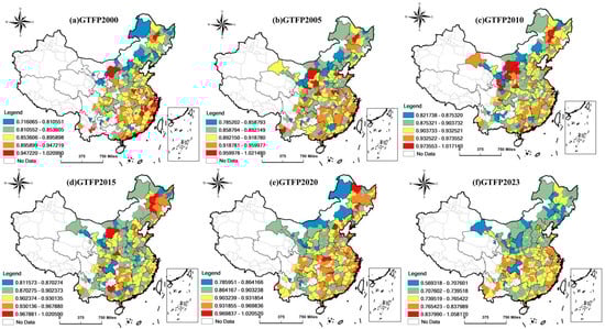 Figure 3 illustrates the spatiotemporal change trends of urban GTFP in China. First, the distribution of urban GTFP in China exhibits a characteristic of being higher in southern cities than in northern cities. From the perspective of the spatial change trends of urban GTFP over the years, cities in so uthern regions, such as Zhejiang, Jiangsu, Fujian, and Guangdong, generally maintain higher GTFP levels. In contrast, cities in northern regions, including Inner Mongolia, Gansu, and Shanxi, have comparatively lower GTFP (See the detailed map of China’s administrative divisions in Figure A1). Second, urban GTFP shows a certain degree of attenuation from east to west. Cities in eastern regions have higher GTFP levels, whereas those in western regions, such as Inner Mongolia, Gansu, Guizhou, Sichuan, and Yunnan, exhibit lower GTFP compared to their eastern counterparts. Third, GTFP levels in different cities display certain fluctuations over time. For instance, GTFP in some cities in Heilongjiang and Jilin (Northeast China) remained relatively high from 2000 to 2020 but declined after 2023. Similarly, GTFP in some cities in Inner Mongolia and Shaanxi was relatively high from 2000 to 2015 but dropped to lower levels after 2020. Overall, urban GTFP in China demonstrates three key characteristics: higher values in the south than in the north, higher values in the east than in the west, and certain temporal fluctuations.