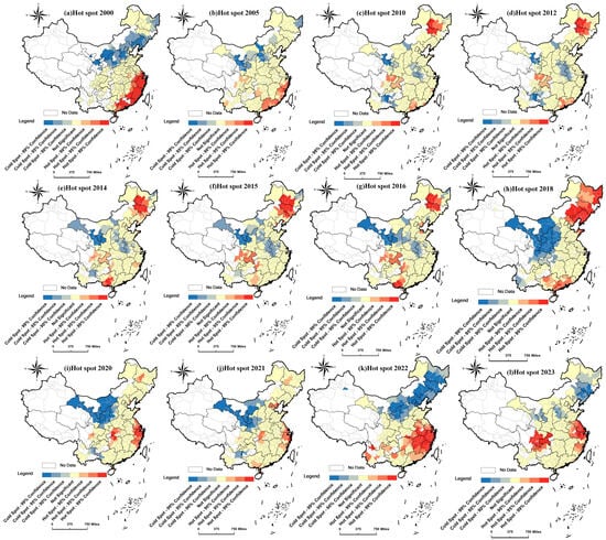 Figure 4 presents the spatiotemporal change trend of the hot-spot analysis of GTFP over the years using the spatial proximity matrix. From Figure 4, it can be observed that between 2000 and 2005, the GTFP exhibited significant hot-spot clusters in southern coastal regions such as Zhejiang, Fujian, and Guangdong Provinces. In these areas, cities with high GTFP were surrounded by neighboring cities with relatively high GTFP. Subsequently, from 2005 to 2018, the clustering pattern of high GTFP cities in southern regions gradually weakened, while significant hot-spot clusters emerged in northeastern regions. Between 2020 and 2023, these high GTFP clusters primarily appeared in parts of Anhui, Jiangsu, Zhejiang, Fujian, Guangdong, Jiangxi, as well as Sichuan, Chongqing, Hunan, Guizhou, Yunnan, and Guangxi, where significant high GTFP agglomeration was observed. However, significant cold-spot clusters emerged in Hebei, Shanxi, Inner Mongolia, and Gansu, where cities with low GTFP were clustered together, forming a spatial pattern of mutual agglomeration of low-GTFP cities. During the period 2020–2023, northeastern regions transitioned from hot spots to cold spots, with cities in these areas exhibiting lower GTFP levels. Notably, in 2022, the cold-spot coverage extended across broader northern regions. Additionally, certain trends in the clustering patterns of urban GTFP can be identified: extensive cold- and hot-spot clusters were observed in 2000, 2018, 2022, and 2023, whereas the scope of these clusters decreased to some extent in 2005, 2010, and 2021.