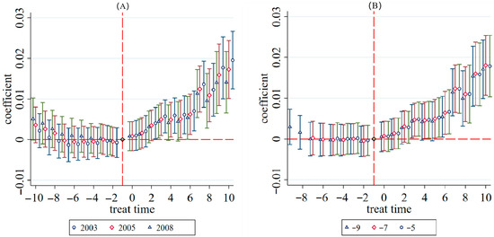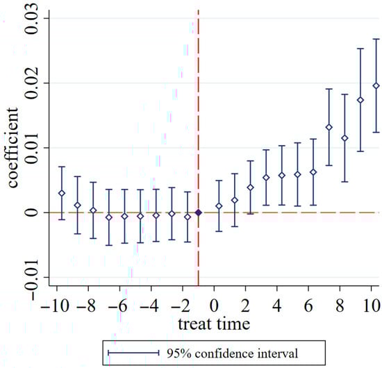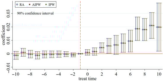 The parallel trend test is a prerequisite for the credibility of the DID method, requiring that no significant differences exist between the treated and control groups before policy implementation. This paper uses a SAR-event-study method to analyze parallel trends. Figure 5 presents the SAR-event-study results using the binary spatial matrix (the estimation results using the time-varying economic weight matrix and time-varying population weight matrix are provided in Figure A2). As shown in Figure 5, before the deployment of cloud computing in cities, the estimated coefficients are close to zero and statistically insignificant, indicating no significant systematic differences between the treated and control groups before the policy intervention. As cloud computing development progresses in cities, the estimated coefficients gradually increase, suggesting that cloud computing construction has a sustained positive effect on the GTFP. Therefore, the overall results indicate that the DID model satisfies the parallel trend assumption.