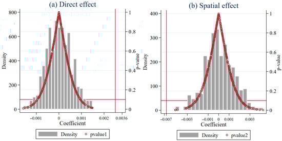 For the placebo test, we constructed a placebo policy by randomly assigning units to the treatment or control group. This process was repeated 500 times to generate the distribution of the estimated placebo coefficients. Figure 6 presents the placebo test results estimated using the binary spatial matrix (the estimation results using the time-varying economic weight matrix and time-varying population weight matrix are provided in Figure A3 and Figure A4, respectively). Figure 6 shows that the placebo coefficients of both the direct effect () and the spatial effect () are different significantly from the true values and are statistically insignificant. This indicates that the placebo policy does not produce a systematic effect, which demonstrate that the benchmark results are robust and pass the placebo test.