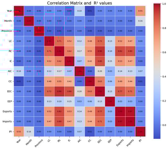 Among macroeconomic indicators, the IPI shows low correlations with most variables except for a moderate association with the ‘Year’ variable (r = 0.55), implying a temporal growth trend rather than immediate covariation with electricity indicators.