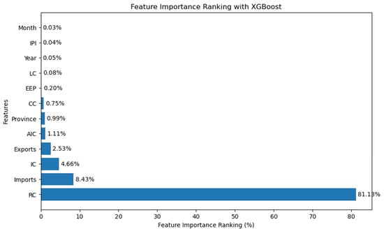 The feature importance ranking for EEC reveals that RC is the dominant predictor, accounting for approximately 71.84% of the model’s explanatory power. This finding highlights a strong and consistent relationship between residential demand patterns and overall electricity consumption trends. LC follows as the second most important feature, contributing 13.70%. IC provides a modest contribution of 2.80%, indicating a secondary role in influencing overall energy demand.