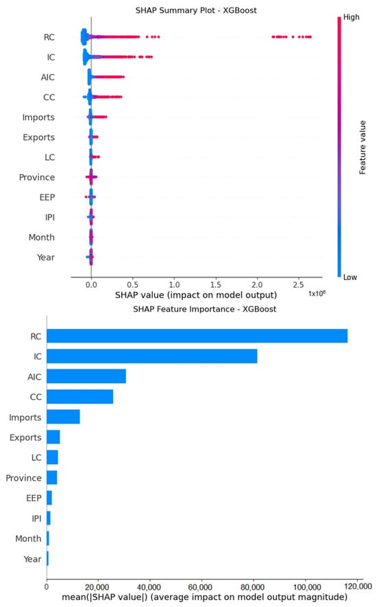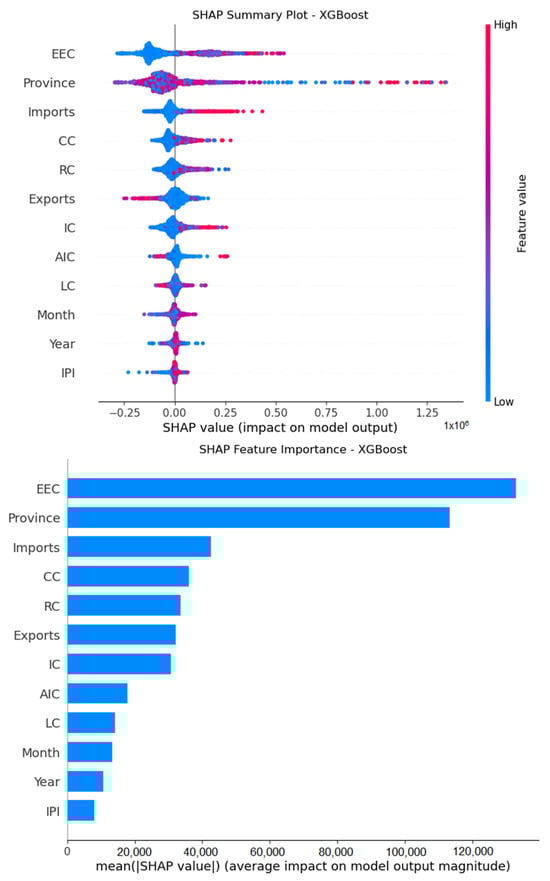 As illustrated in Figure 4, the SHAP summary and bar plots reveal that RC is the most dominant factor influencing electricity demand, accounting for approximately 71.84% of the model’s explanatory power. LC and IC follow, contributing 13.70% and 2.80%, respectively. Other sectoral variables, such as AIC and CC, make modest contributions, while macroeconomic indicators (e.g., electricity production, imports, exports, and the IPI) exhibit minimal influence, each contributing less than 0.5%. Temporal (Year, Month) and spatial (Province) features collectively account for less than 3%, emphasizing that sector-specific consumption patterns primarily drive variations in electricity demand during the 2016–2024 period.
