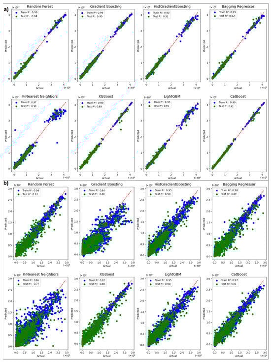 Actual vs. Predicted EEC (a) and EEP (b) Values Using Eight Machine Learning Models. The scatter plots illustrate the predictive accuracy of each model by comparing observed and estimated values for both energy consumption and production. The red dashed line represents the ideal fit (y = x), while blue and green dots correspond to the training and testing datasets, respectively.