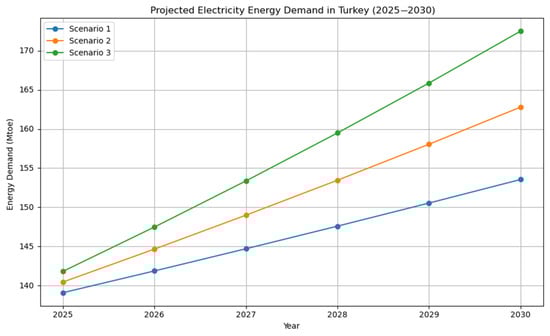 Medium- and long-term energy demand projections were modeled for the period 2025–2030 under three distinct scenarios. Each scenario was constructed based on different assumptions regarding economic and demographic growth. These scenarios contribute to the evaluation of potential future conditions in Turkey’s energy policy-making process.