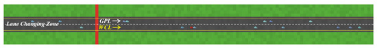 Figure 1. A schematic diagram of a two-lane road system. The red bar represents the boundary between the two-lane road system and the lane-changing zone. - Once an EV enters the GPL or WCL, lane changing behavior is restricted unless its SOC drops below the minimum or exceeds the maximum threshold. All EVs obey this rule, which is enforced by the advanced ITS.