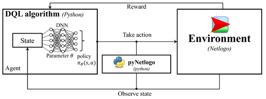 This section introduces the basic elements of the ABM and the Deep Q-learning algorithm we adopt. The conceptual design of the interaction between our ABM and the deep Q-learning algorithm is depicted in Figure 2. It can be seen that the ABM (i.e., the environment of the Deep Q-learning algorithm) is coded in NetLogo (introduced in Section 4.2) by extending the existing model “Traffic 2 lanes” in the NetLogo Library [34], which has been used in a number of traffic problems. For example, ref. [35] extends the model to explore the ways to overcome traffic congestion on toll roads. Ref. [36] develops a new traffic simulation environment in NetLogo to explore an intersection control task. In this paper, we incorporate the rules of the double-lane system, depicted in Figure 1, and the SOC dynamics of EVs into the model. Since the deep Q-learning algorithm is coded in Python 3.7, we adopt the pyNetLogo 0.5 library to build the bridge between the algorithm and the environment [37]. The pyNetLogo 0.5 library provides a seamless interface enabling Python to interact with NetLogo. By integrating this library, we are equipped with capabilities to dynamically load models, execute NetLogo-specific commands, and extract data from reporter variables. Such functionalities are instrumental for the training of our deep Q-learning algorithm in an online fashion.