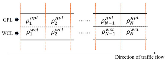 The state consists of traffic states and the future traffic demand. For the representation of traffic states, we first divide the road system under consideration into N segments (each segment is assumed to be identical), as depicted in Figure 4. Let be the vectors collected the normalized traffic densities on the GPL and the WCL, respectively, (The state space is deliberately macroscopic: it encodes only the number of EVs per segment. This is sufficient because the pricing policy acts on aggregate lane-choice probabilities rather than on individual trajectories. Microscopic uncertainties average out at the segment level, and any residual error can be reduced by shortening the segment length. When RL is employed for micro-control tasks that involve vehicle-level actions, on the other hand, the state representation should explicitly account for the positions and speeds of individual EVs [26,29].). Then, we have