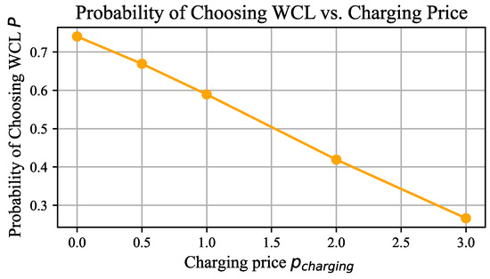 where piecewise satisfies the traffic rule that an EV whose SOC is below its minimum SOC level will choose the WCL—while an EV whose SOC exceeds its maximum SOC level will choose the GPL. Then, the choice probability of i-th EV for each lane at time t, denoted as , can be expressed as