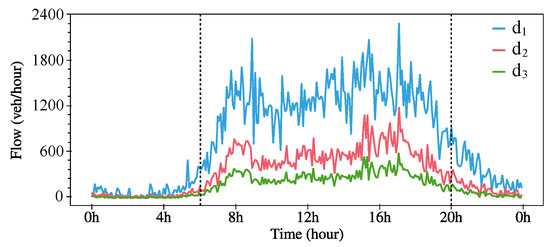 - Total throughput (): This denotes the cumulative number of vehicles that pass a specific point, such as the entrance of the road, within a given time interval, measured in vehicles per hour (veh/h).