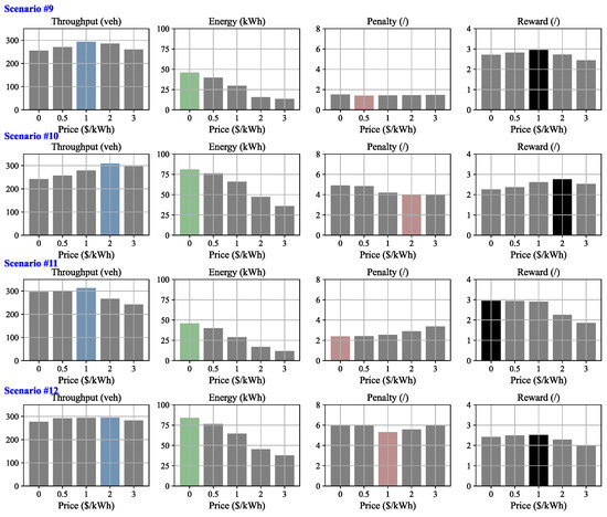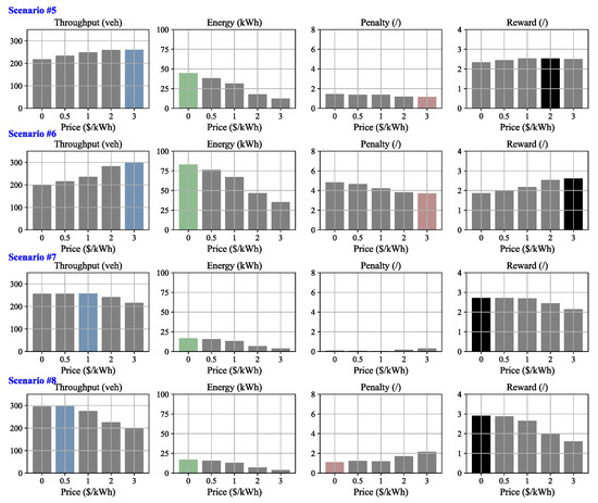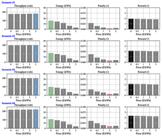 In scenario #1, where the system begins with light traffic and experiences a low traffic demand, both the CART and DQL algorithms consistently opt for the lowest charging price (0 USD/kWh) at each pricing interval throughout the simulation. This leads to an increase in the number of EVs entering the WCL, thereby resulting in more energy being transmitted to EVs. This phenomenon aligns with the analysis in Section 6.1, indicating that a lower charging price under light traffic conditions enhances the charging efficiency without sacrificing the traffic efficiency. The strategy of giving the base price (1 USD/kWh) throughout the simulation yields a total throughput of 1349 veh, a total energy of 17.6 kWh, and a penalty of 0.036. In contrast, the CART and DQL algorithms yield almost the same total throughput, over five times energy (94.4 kWh), but a bit higher penalty for traffic congestion (0.064, however, still at a low level). Consequently, the accumulated reward yielded by the dynamic pricing strategy is 6.7% higher than the static pricing strategy.