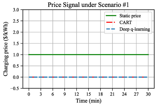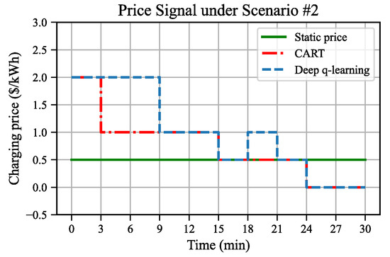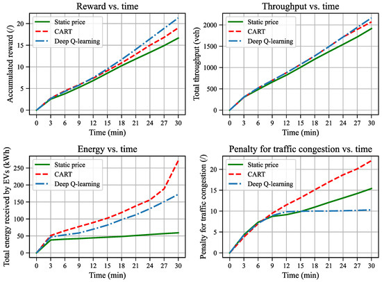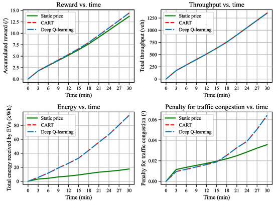 In scenario #2, the system starts under heavy traffic conditions with sustained high demand throughout the simulation. As illustrated in Figure 14, the pricing trends demonstrated by the CART and DQL algorithms start at a high price (2 USD/kWh) and progressively decrease, culminating in the minimum price (0 USD/kWh). The DQL algorithm shows performance improvements in the final reward of 12.1% over CART and 28.3% over the static pricing strategy. The reasons are as follows. As the initial congestion on the WCL is greater than that on the GPL, both algorithms implement a high price (2 USD/kWh) at the beginning. This effectively leads more EVs to the GPL, alleviating congestion on the WCL. Subsequently, as congestion eases, the focus shifts towards maximizing energy transmission, leading to lower prices. In the final stages (24 to 30 min), the system reverts to light traffic conditions, similarly to scenario #1, where a lower price is advantageous for maximizing energy delivery without compromising traffic efficiency. However, the pricing strategies of CART and DQL differ significantly. CART is not capable of capturing the system dynamics or utilizing the future traffic demand information but only selects optimal prices for the current interval. Although the traffic demand remains high throughout the simulation, CART still adopts a more aggressive pricing approach at the early stages to maximize the immediate rewards. In contrast, the DQL algorithm adopts a more nuanced strategy, maintaining a lower price of 1 USD/kWh between 3 and 9 min, which, despite temporarily reduces energy growth, minimizes congestion penalties and enhances throughput. Consequently, from 9 to 15 min, the energy growth under both strategies aligns, yet the congestion penalty remains significantly lower under the DQL approach. Thus, CART’s strategy is myopic, whereas DQL’s farsighted approach better captures the complexities of the environment and effectively leverages the future system inputs, highlighting its superior capability in managing complex dynamic traffic scenarios.