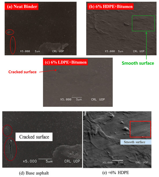 Researchers utilized fluorescent microscopy to analyze the structural network and polymer distribution in dried emulsified asphalt samples, which were prepared through different methods of latex addition [108,109]. Recent studies utilized scanning electron microscopy (SEM) to explore the modification mechanism of asphalt by adding 10% to 12% (wt.) PET, highlighting the most effective mixture compositions [110]. The ideal range of PET waste for modifying asphalt is between 10% and 12% (wt.), with the modified mixtures showing superior performance compared to unmodified asphalt. In addition, the modification process of waste polyethylene (PE) and polyvinyl chloride (PVC), sourced from recycled beer shrink film bags, was studied.