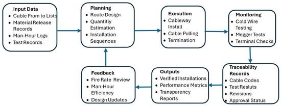 A practical and traceability-focused electrical outfitting management process was formulated using complete lifecycle data from the 10,000 DWT chemical tanker project (see Figure 1). The revised GEOTM process flow connects the design, procurement, production, and testing phases through seven coordinated stages. These include: (1) Input Data, which brings together design information, material release records, man-hour logs, and test documentation; (2) Planning, where route design, quantity estimation, and installation sequencing are carried out; (3) Execution, covering the installation of cableways, cable pulling, and termination tasks; (4) Monitoring, involving cold-wire testing, megger measurements, and terminal inspections; (5) Traceability Records, in which cable codes, test outcomes, revisions, and approval statuses are digitally confirmed; (6) Outputs, summarizing verified installations, performance indicators, and transparency reports; and (7) Feedback, where fire-rate assessments, efficiency reviews, and design improvements are incorporated into future planning. Decision checkpoints—covering design approval, material validation, installation quality, and testing results—are embedded throughout the process to ensure full coordination between design, procurement, and production teams. This closed-loop structure enhances traceability, encourages continuous improvement, and enables data-driven management across the entire electrical outfitting cycle.