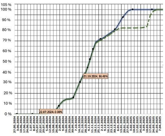 The project commenced with a 0% baseline on 22 July 2024, with planning indicating a smooth ramp-up. By 21 October 2024, the planned progress reached approximately 58%, while the actual (green) curve lagged slightly at 36.4%, indicating early-phase delays potentially due to unforeseen material delivery constraints or workforce mobilization. The maximum discrepancy between planned and actual trends occurred around mid-November 2024, reaching a peak offset of nearly 13.5%, which statistically aligns with the bottleneck period for cable pulling in the GEOTM execution model.
