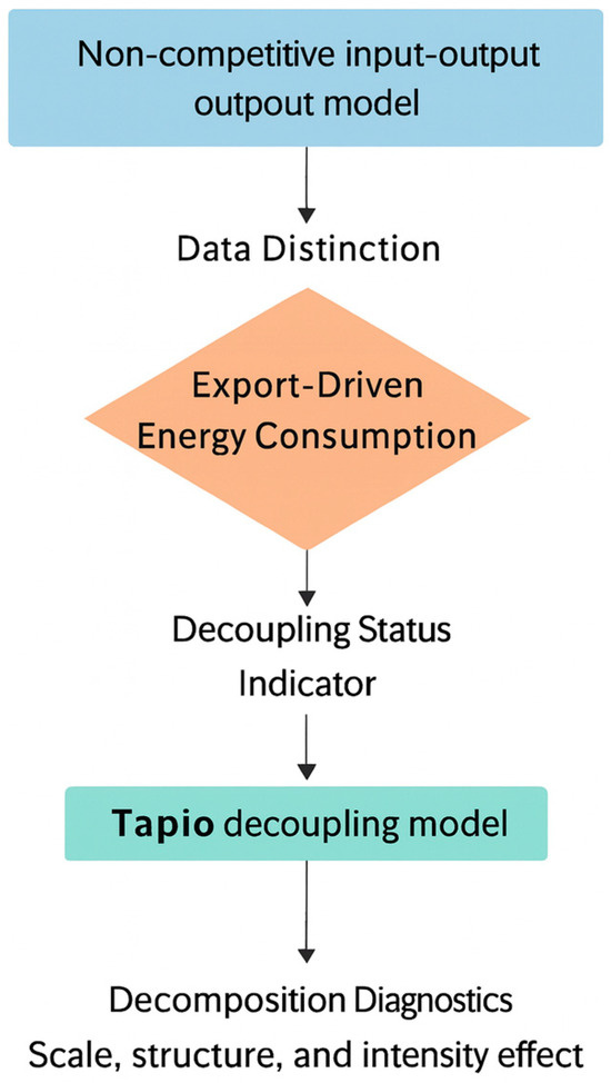 To enhance clarity for non-specialist readers, Figure 1 presents a schematic overview of the logical integration among the three core models employed in this study. First, the non-competitive input–output model distinguishes between the energy consumption of domestically produced and imported intermediate goods, forming the foundation for calculating energy consumption specifically attributable to export activities. This serves as the data input layer. Second, the Tapio decoupling model utilizes the derived energy consumption data and export volume growth to assess the elasticity relationship, thereby identifying decoupling states across different time periods and sectors—this constitutes the indicator analysis layer. Third, to interpret the drivers of observed decoupling dynamics, the LMDI decomposition model disaggregates changes in export-related energy consumption into three components: scale, structure, and intensity effects. This provides a deeper analytical lens on how export expansion, trade restructuring, and energy efficiency, respectively, contribute to decoupling outcomes. Together, these models form a closed-loop methodological chain—linking physical accounting, policy-relevant indicators, and decomposition-based diagnostics—to ensure consistent, multi-layered interpretation.