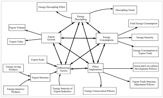 At its core, the diagram highlights the pivotal role of export growth—an essential driver of economic development—and its inherent linkage to energy consumption. It illustrates the critical impact of export structure, sector-specific energy intensity, and technological advancements on decoupling efficiency. By emphasizing the transition toward energy-efficient and high-tech export sectors, the diagram underscores how strategic shifts can reduce energy consumption while sustaining or enhancing export value.