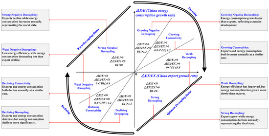 Building upon the classification methods outlined by Sun and Song (2024), Sun et al. (2024) and Sun et al. (2025), and following Tapio’s (2005) elasticity criteria, this study categorizes the decoupling between export trade growth and energy consumption into positive, linking, and negative decoupling types, as detailed in Figure 3 [42,43,44,45]. Positive decoupling, which is the most desirable state, occurs when export growth exceeds energy consumption increases. In contrast, negative decoupling reflects increased energy consumption outpacing export growth, where strong negative decoupling is the least favorable scenario.