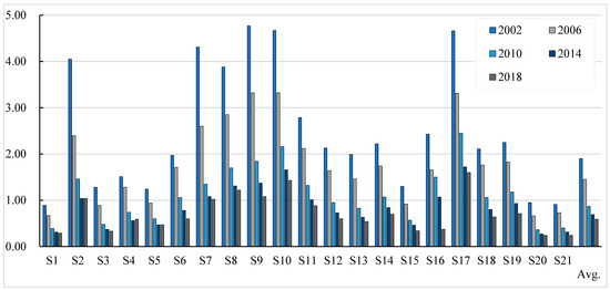 This analysis quantifies the energy consumption intensity of China’s export trade from 2002 to 2018 across various sectors using Equation (1), which is detailed in Figure 4 and Figure 5. Energy intensity per CNY 10,000 of export trade decreased progressively from 2.49 TCE in 2002 to 0.71 TCE in 2018. This corresponds to reductions of 23.69%, 40%, 20.9%, and 14.74% for the intervals 2002–2006, 2006–2010, 2010–2014, and 2014–2018, respectively, culminating in an overall decrease of 69.17%. These reductions underscore the substantial gains in energy efficiency in China’s export sector since its WTO accession, which were significantly influenced by the continuous energy conservation efforts initiated in 2003 and integrated into the nation’s economic development strategies.