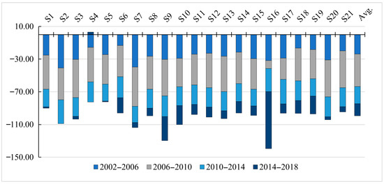 Our analysis of energy consumption intensity trends from 2002 to 2018 reveals consistent decreases in most of China’s export sectors initially, with significant reductions from 2002 to 2006 and continued progress from 2006 to 2010. However, the pace of reduction decelerated during the 2010–2014 period. In the latest interval (2014–2018) the overall decrease in energy intensity slowed even further, with notable exceptions in textiles, clothing, and leather products (S4) and coal, oil, gas, metal, and nonmetal mining (S2) sectors, both of which registered increases in energy consumption intensity. This trend underscores the need to develop strategically targeted interventions to address sectors in which energy efficiency gains are stagnating or reversing.