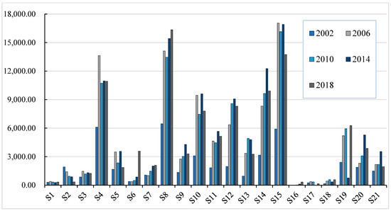 We simplify the energy consumption data across 21 defined sectors to S1–S21, which are integrated from these diverse sources to provide a nuanced understanding of the influencing factors on the decoupling process within China’s export sector in Table 2. The harmonization of sectoral classifications between the WIOD (ISIC Rev.4, 56 sectors) and the Chinese 2018 input–output tables (GB/T4754-2017 [48], 21 sectors) followed an aggregation mapping process summarized. WIOD sectors with similar production and energy-use characteristics were merged to align with the 21-sector Chinese classification. For example, “Manufacture of textiles, wearing apparel and leather products” (WIOD sector 6) corresponds to “Textiles, clothing and leather products” (S4) in the Chinese system, while multiple WIOD service sectors (37–56) were aggregated into “Other services” (S21). This concordance ensures both structural comparability and analytical consistency across all five benchmark years (2002, 2006, 2010, 2014, 2018).
