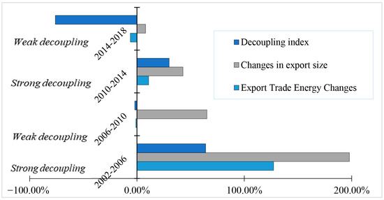 The DIs quantifying the relationship between China’s export growth and energy consumption from 2002 to 2018 are calculated using Equation (4) and presented in Figure 6. During the initial period of 2002–2006, China’s export trade surged by 197.85%, while energy consumption increased by 127.29%, with a DI of 0.64, which indicates a weak decoupling state that is still considered favorable, as illustrated in Figure 7.